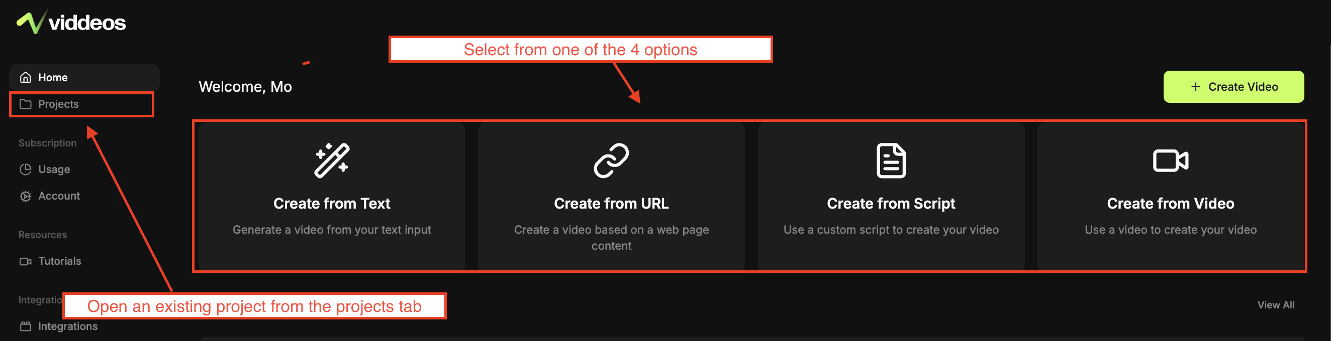 Start a new video using one of the four options or open an existing project from the Projects tab.