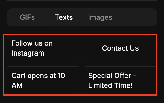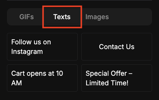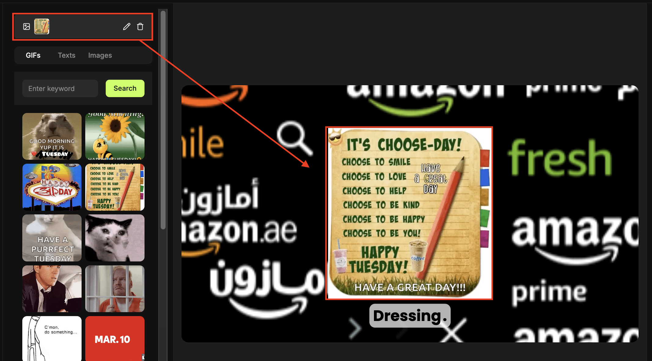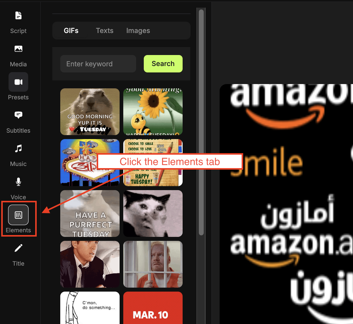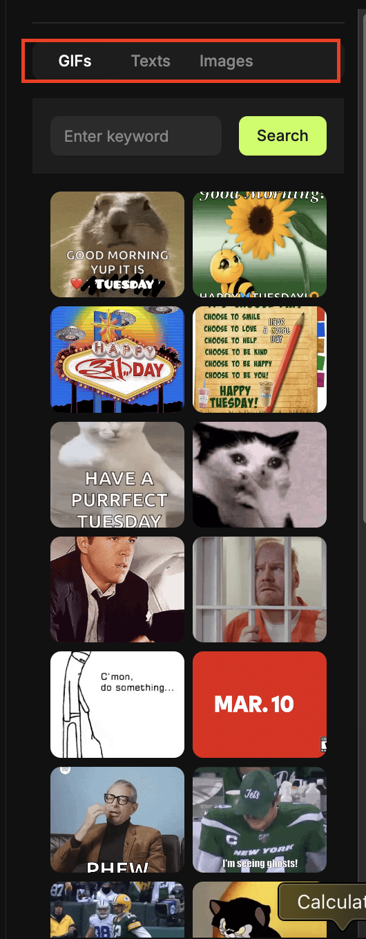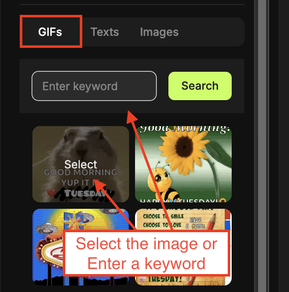 Go to GIFs and select a GIF from the available options or use the search bar to find one.