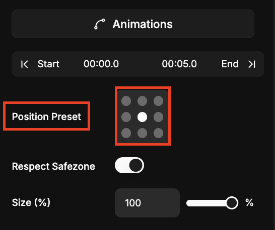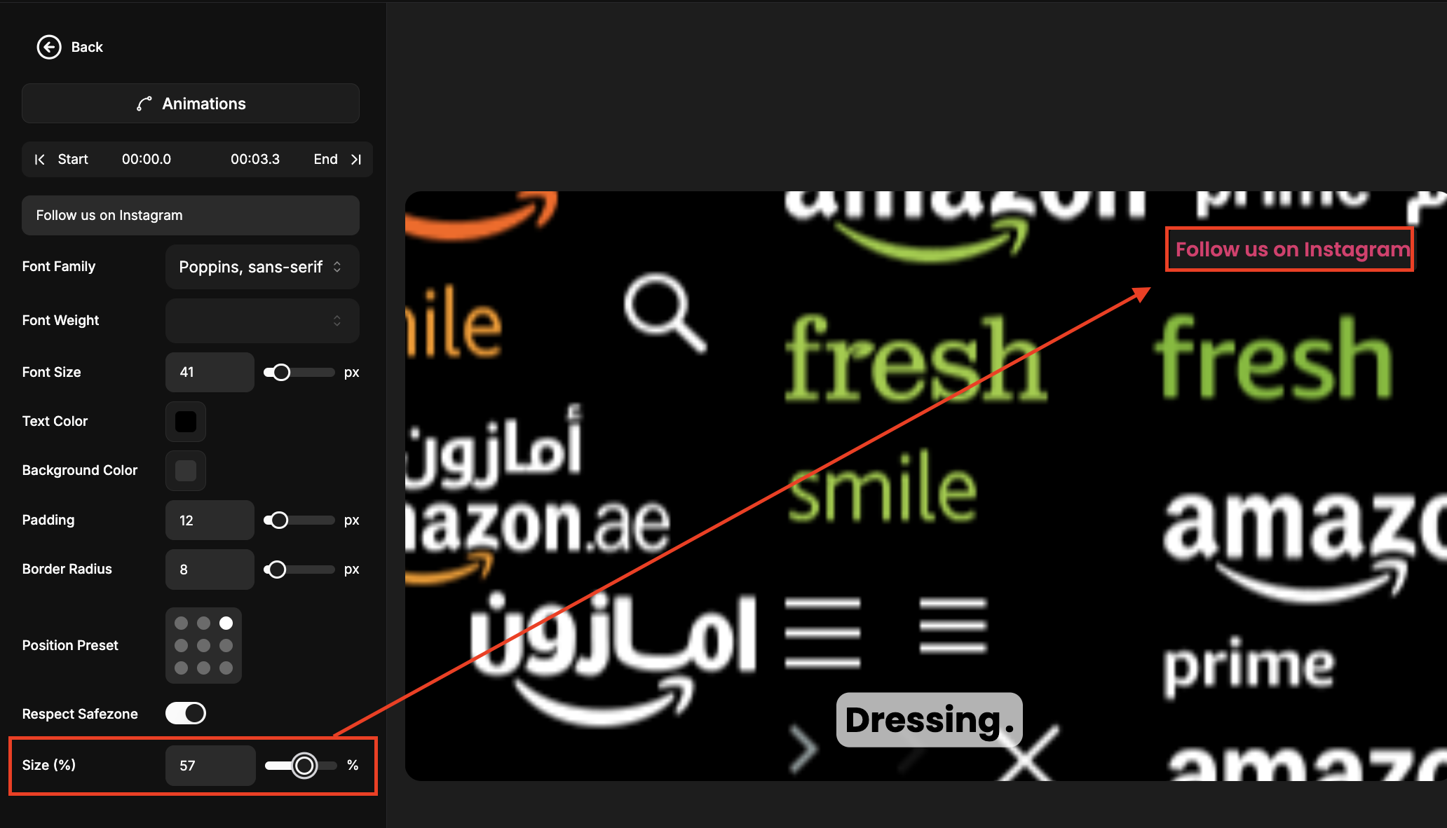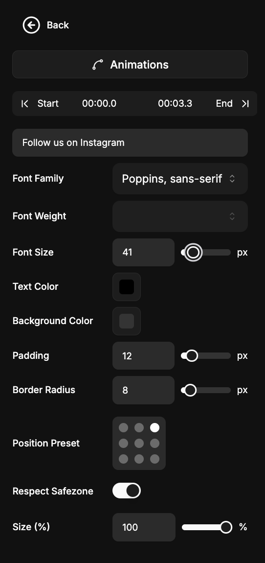 From there, you can change font style, size, text color, and background color, adjust position (e.g., move it to the middle), or use Respect Safe Zone to keep text within the safe display area for all platforms.