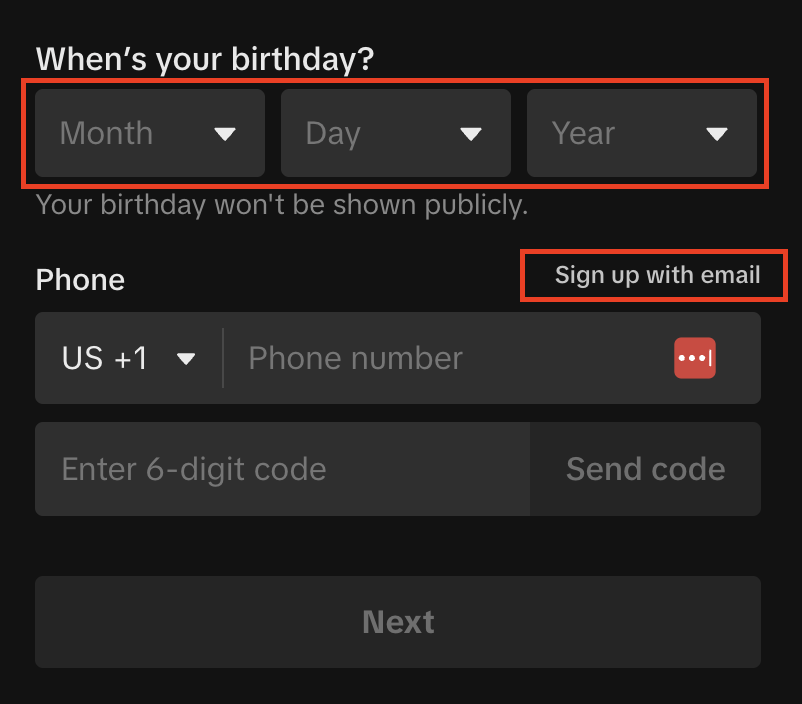 Enter your birthdate to verify your age and Click Sign up with Email