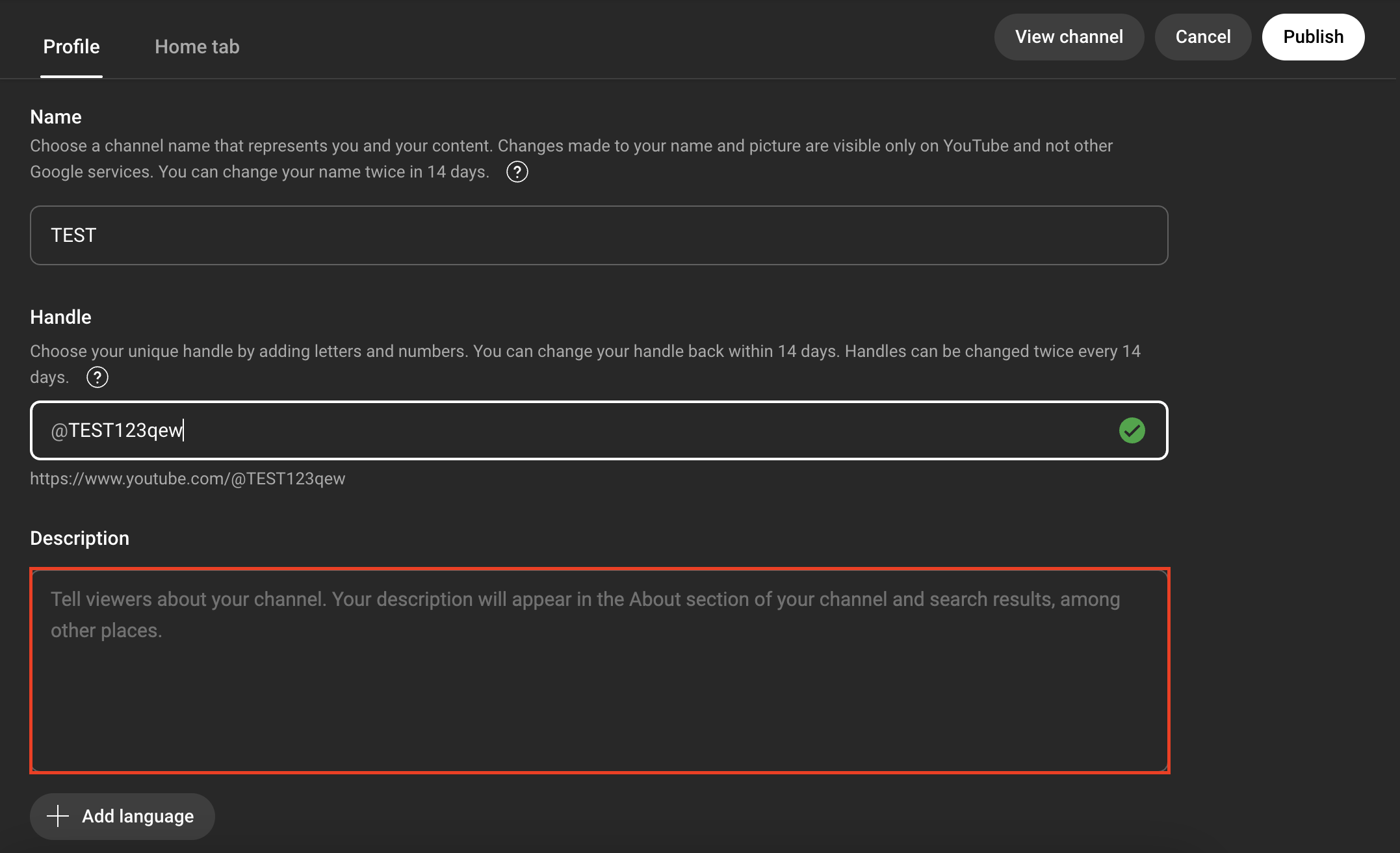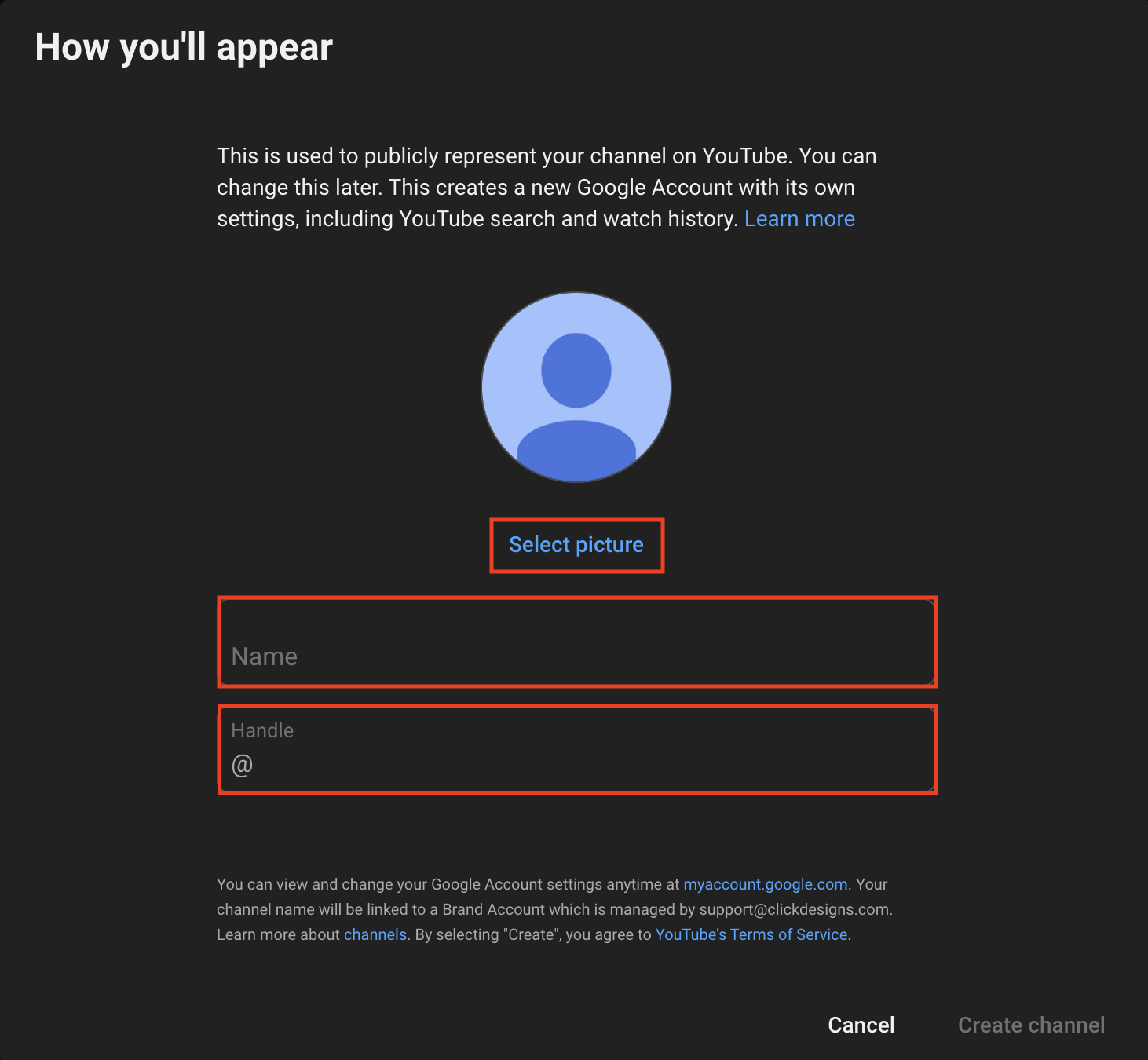 - Handle: Choose a unique handle for your channel.