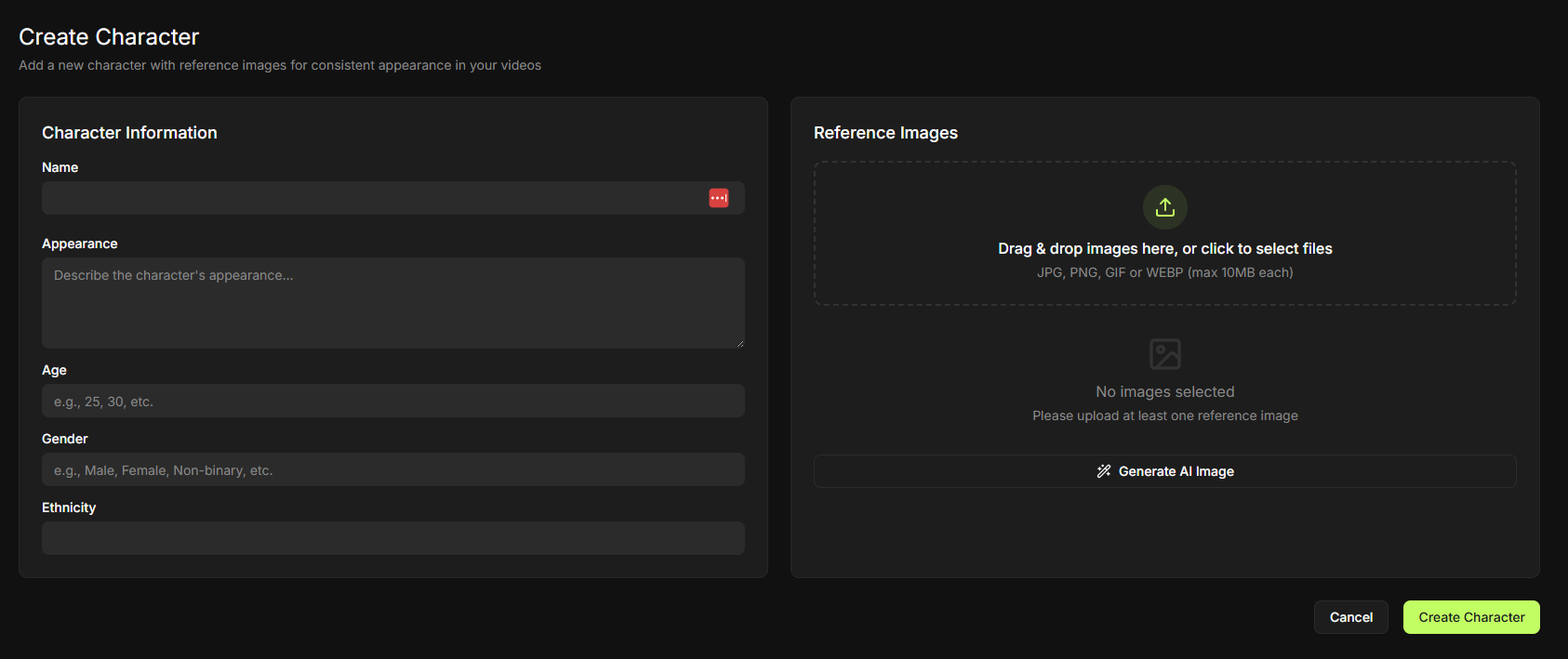 - You can create and save unlimited characters, but you can only cast up to 4 characters per video.