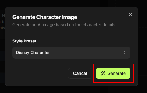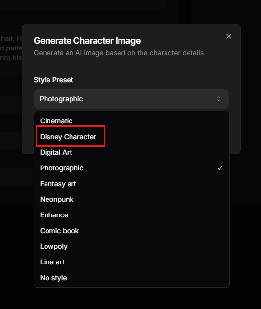 - Choose a style preset (e.g., Disney Character).