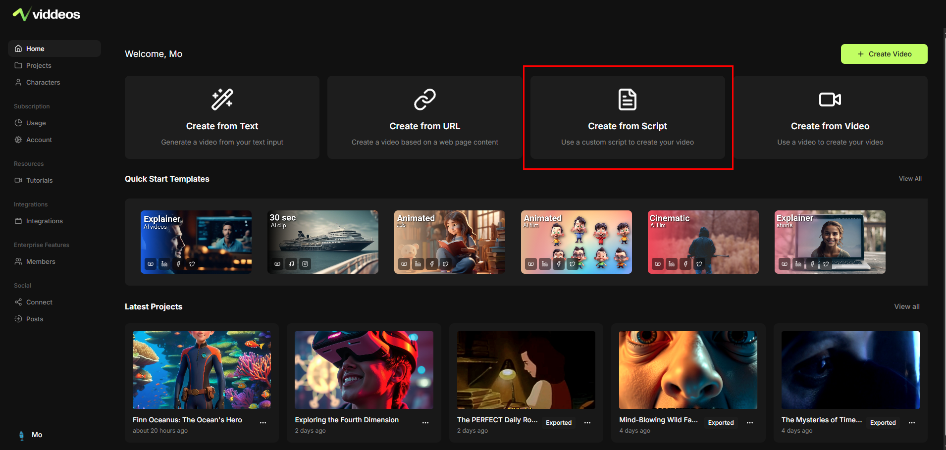 - Start a new video by selecting “Create from Script.”