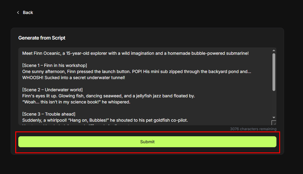 - Paste your prepared script and click “Submit.”