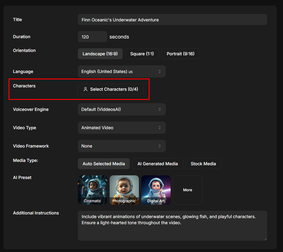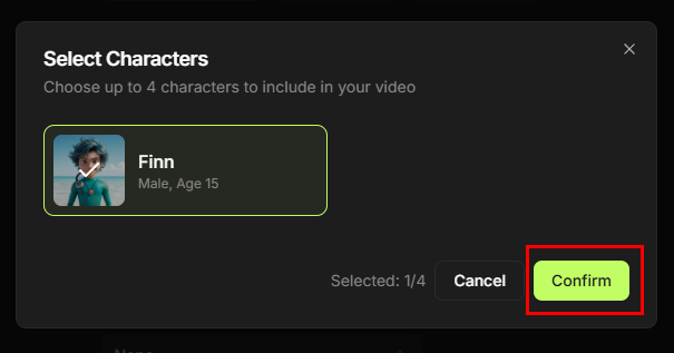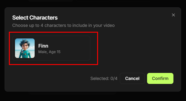 - You can select up to 4 characters per video.